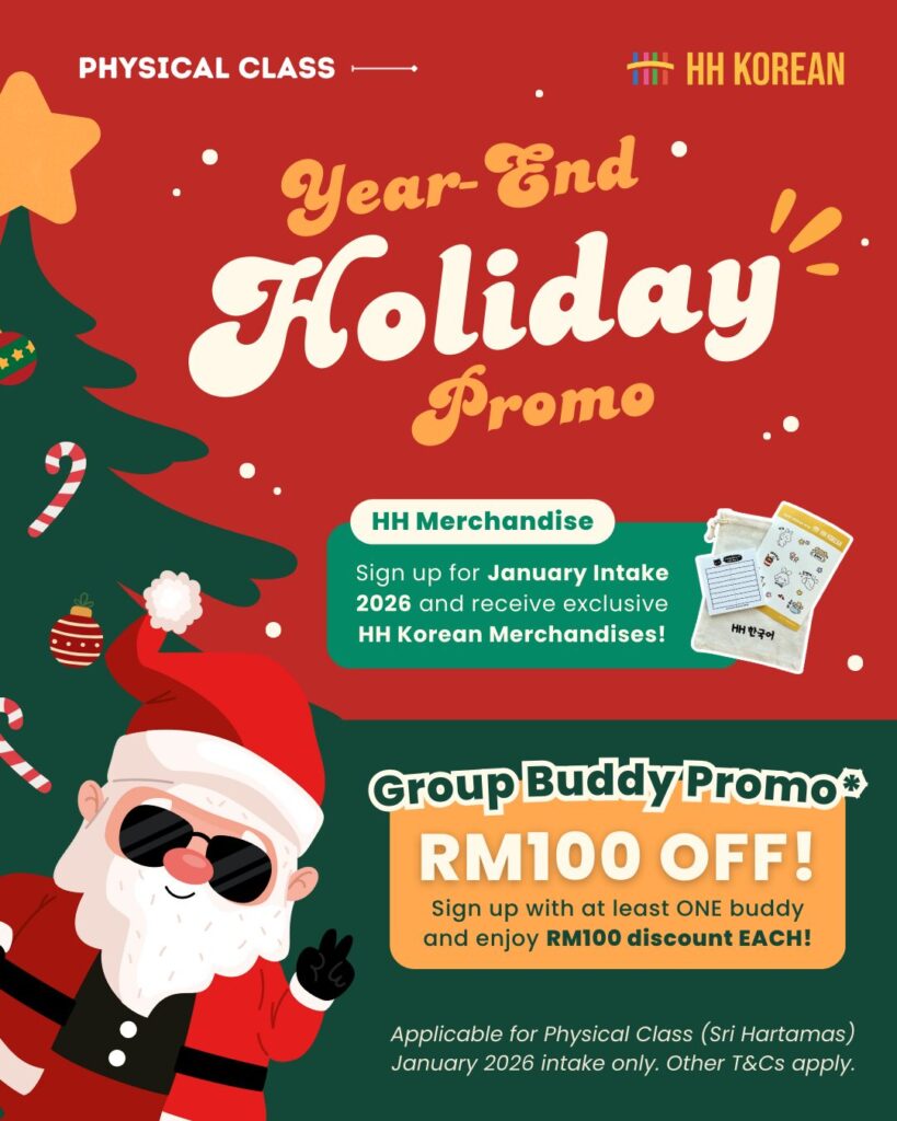 Year-End Holiday Promo Sign up for January 2026 intake at HH Korean Sri Hartamas Physical Class and enjoy: Exclusive HH Korean merch • HH Korean pouch bag • Vocabulary memo pad • Cute sticker sheet Group Bundle Promo (sign up with friends, minimum 2 students) • RM100 discount to each student Registration period: 11